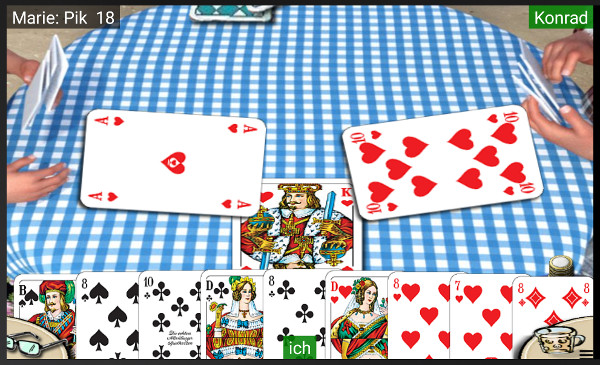 Skat, der Kartenspiel Klassiker! Spiel ihn jetzt mit Sprachausgabe und Hintergrundgeräuschen auf Deinem Handy oder Tablet wie am Stammtisch.