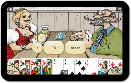 Skat, der Kartenspiel Klassiker! Spiel ihn jetzt mit Sprachausgabe und Hintergrundgeräuschen auf Deinem Android Handy oder Tablet wie am Stammtisch.
